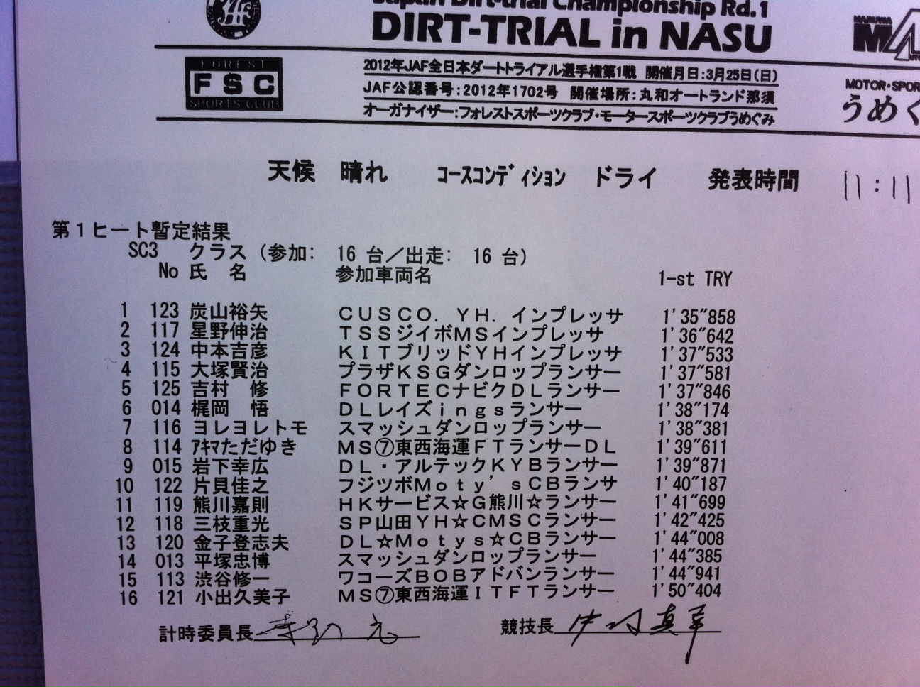 > 全日本ダートラ丸和 SC3クラス第1ヒート暫定結果