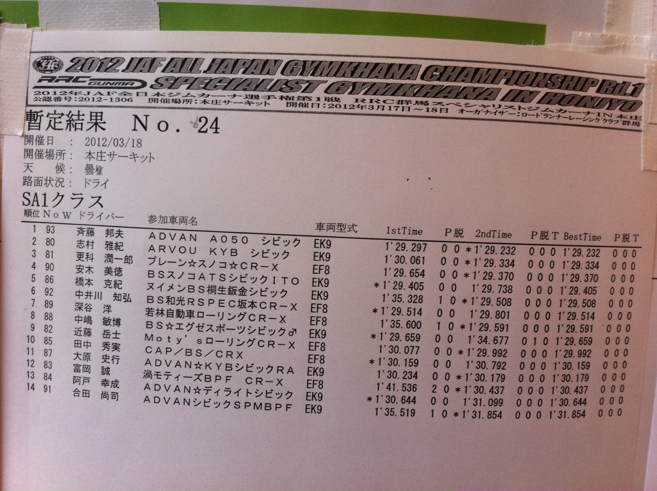 全日本ジムカーナ本庄 SA1クラス暫定結果
