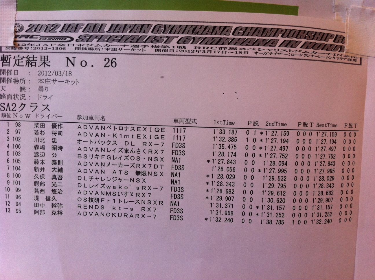 全日本ジムカーナ本庄 SA2クラス暫定結果