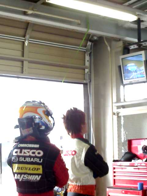 フリー走行終了。最後に山野選手と青木選手のドライバー交代とタイヤ交換などのピット作業の練習。他チームのタイムが気になるモニターを見つめる青木選手。