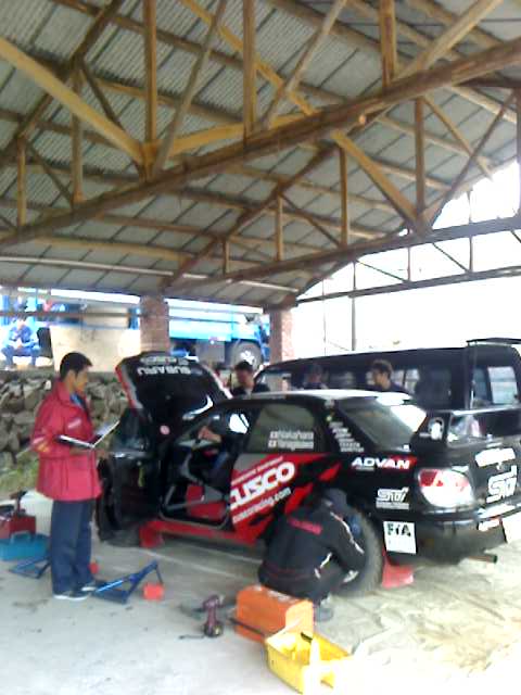 前日残業して車を仕上げて、本日、合同テストに参加中です。4チーム、計11台も集まってしまい、走行回数が限られてします。 民家の軒先を借りてサービスです。