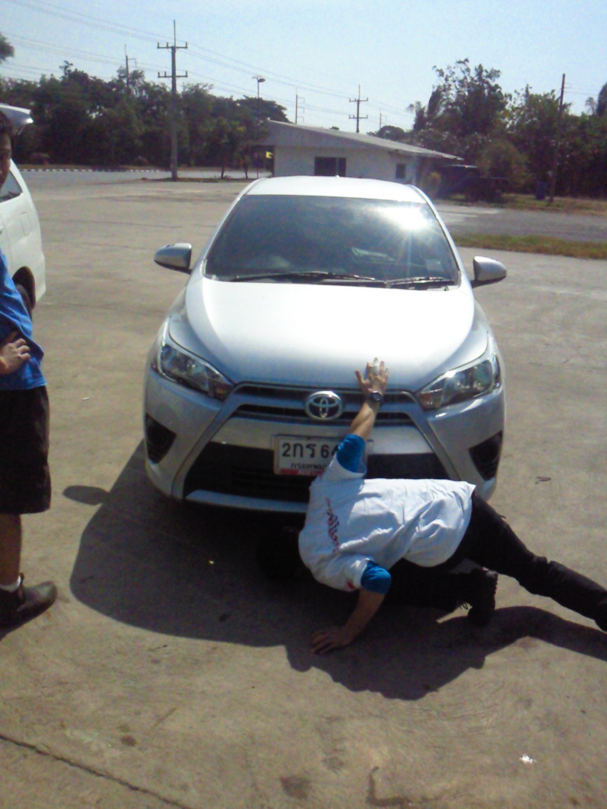 レッキ初日の牟田選手。「レッキ車もまったく問題有りません!」と、元気にレッキのサービスに戻ってきましたが、メカニックに下周りのダメージを発見されてしまいました。