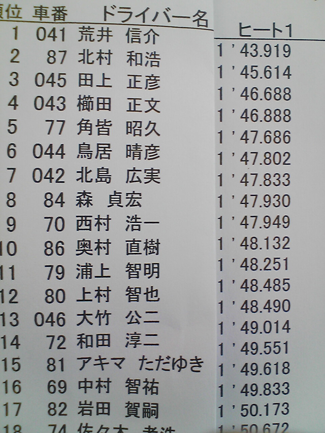 SA2クラスの1本目のリザルトです、荒井選手は1分43秒919で1位です
