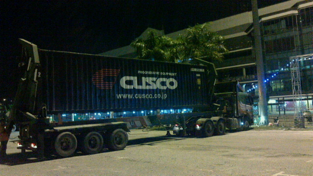 APRCマレーシアのサービスパークとなるショッピングセンターの駐車場にお店の閉店時刻を待って、コンテナの搬入中です。