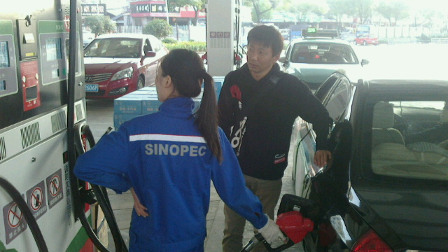全日本新城ラリーを終えてすぐに中国に飛んできた炭山選手です。レッキ用のレンタカーを借り出したら、燃料が空っぽで、さっそく給油中です。