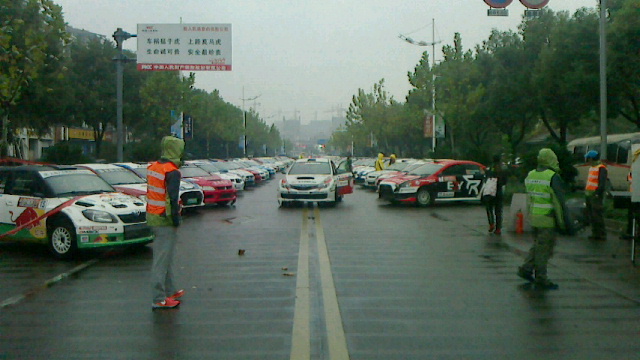 雨の中、本格的な競技開始です。これも豪快に道路をふさいだパルクフェルメからLEG1セクション2スタートです。