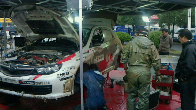 炭山選手が2位でサービスに戻って来ました。ボディサイドの汚れがステージの過酷さを語ります。