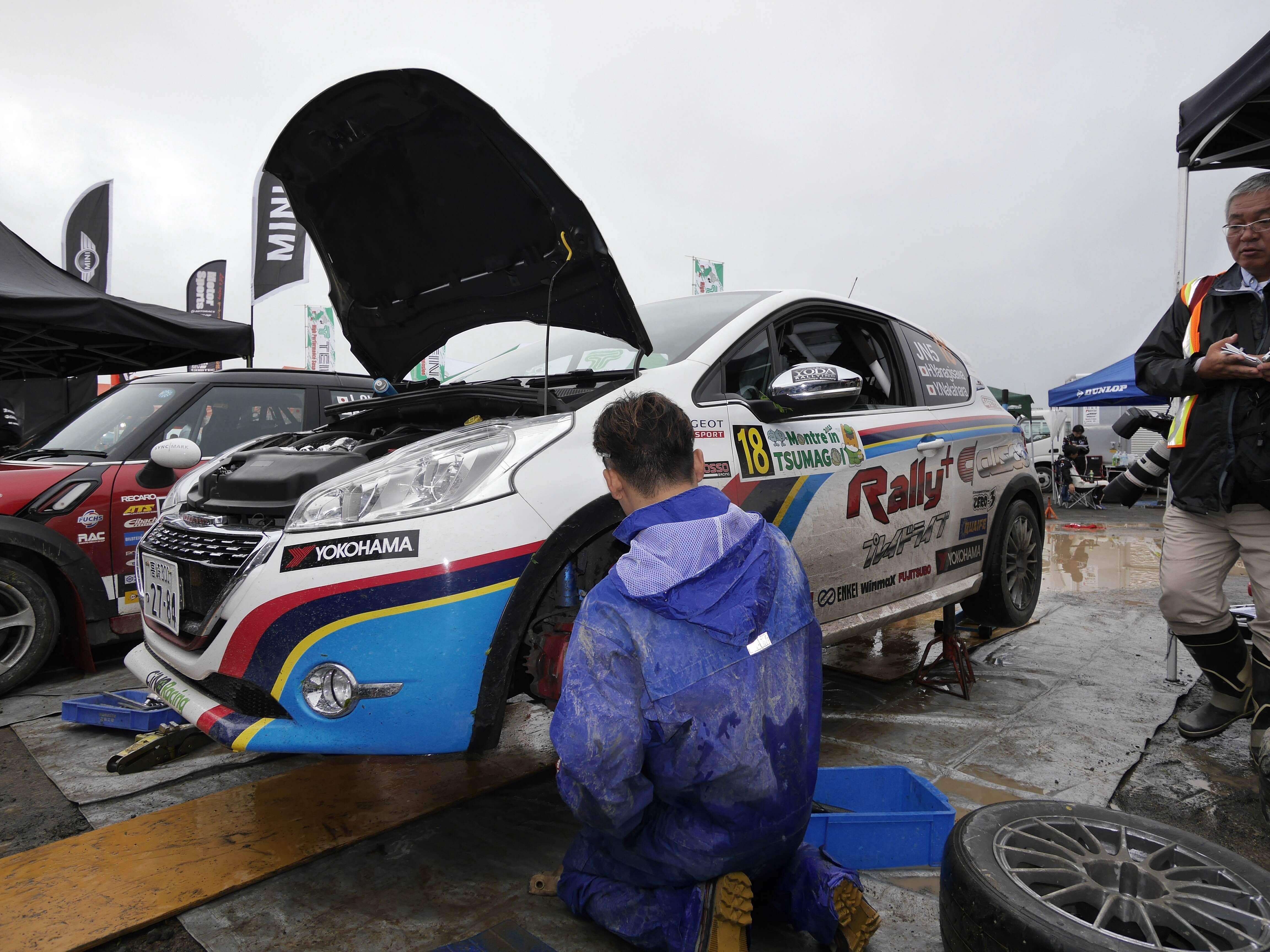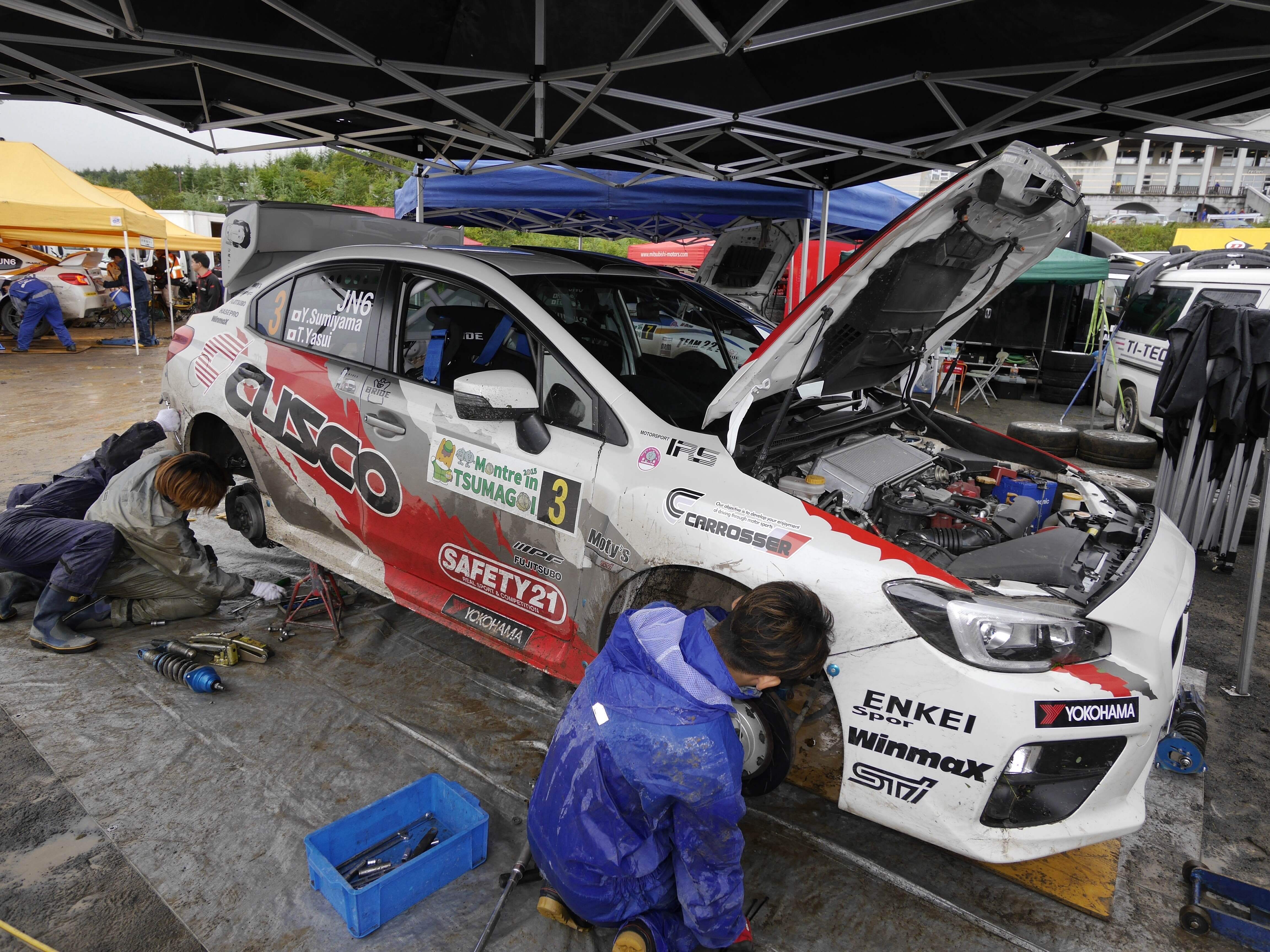 DAY1最終サービスにクルーとマシンが帰ってきました。明日はグラベル区間があるので、各車足廻りをグラベル仕様に換装中。