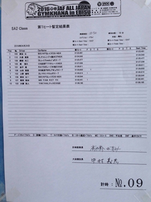 2016全日本ジムカーナ第2戦 エビス決勝第1ヒート暫定結果