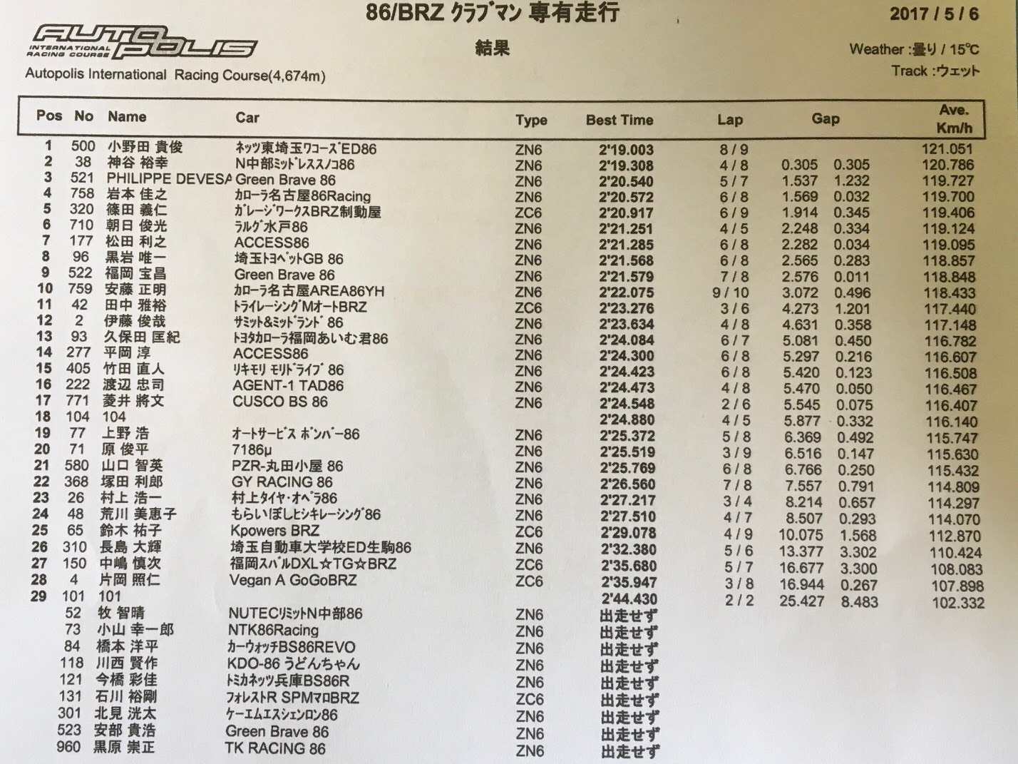 2017GR86/BRZレース、本日の占有走行結果