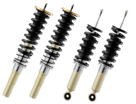 アッパーマウントレス(一部車種アッパーマウント付)ゴツゴツ感、フワフワ感がなく乗っていて疲れないサスキットです。ノーマルアッパーマウントを使用することで、価格面をおさえ、走行中の静音性を確保しました。初めて車高調をいれる方が使いやすいタイプです。