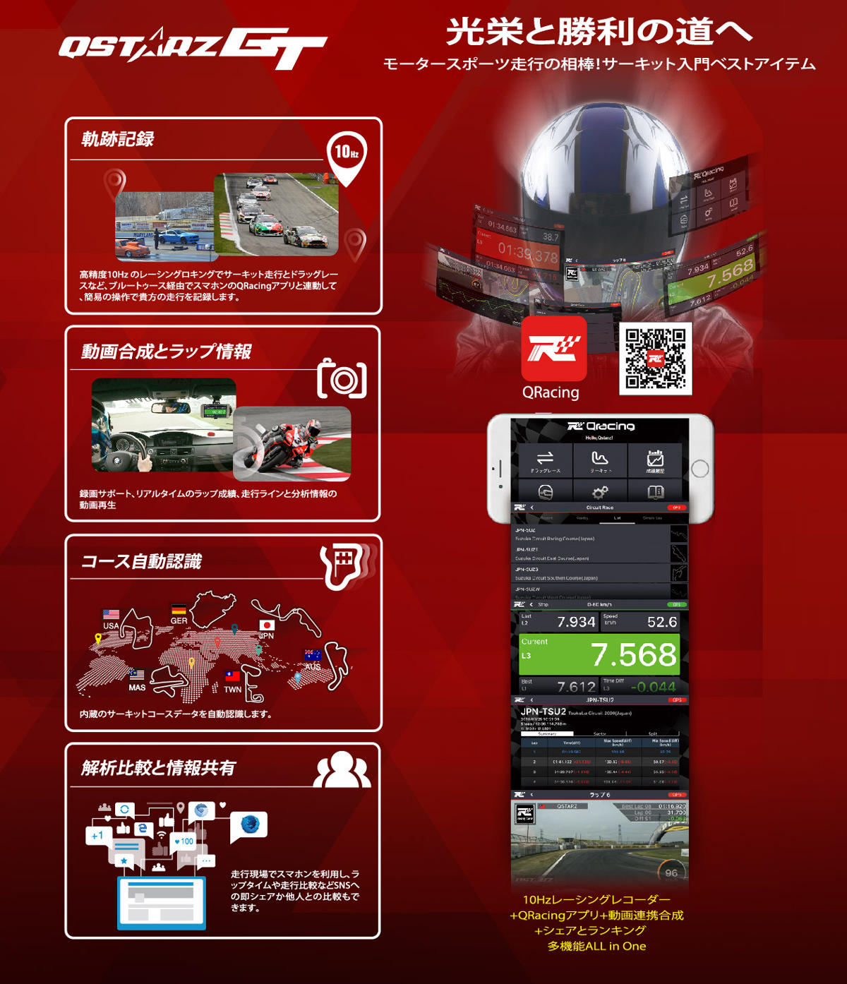 ●専用QRacingアプリ(iOS&Android)を使用しラップタイムや走行ラインなど、インターネット上のSNSでシェアすることが可能。仲間同士で走行データの比較等で楽しむことが可能。